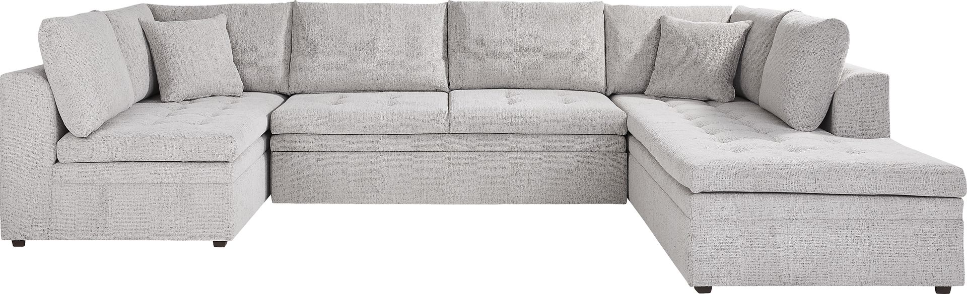 Take it easy in style when you bring home the Sheridan Place sectional from Cindy Crawford Home. Highlighted by tufted cushions and gray chenille upholstery, this contemporary sectional has a right arm facing chaise sofa alongside an armless sleeper and a left arm facing loveseat. The sleeper seamlessly pops up to create the perfect guest suite for overnight company. Loose back cushions add a distinct casualness to the piece. Upholstery: 100% Polyester. Cleaning Instructions: Use water based cleaning agents or foam.