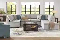 Take it easy in style when you bring home the Sheridan Place sectional from Cindy Crawford Home. Highlighted by tufted cushions and gray chenille upholstery, this contemporary sectional has a right arm facing chaise sofa alongside an armless sleeper and a left arm facing loveseat. The sleeper seamlessly pops up to create the perfect guest suite for overnight company. Loose back cushions add a distinct casualness to the piece. Upholstery: 100% Polyester. Cleaning Instructions: Use water based cleaning agents or foam.