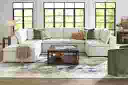 Take it easy in style when you bring home the Sheridan Place sectional from Cindy Crawford Home. Highlighted by tufted cushions and off-white chenille upholstery, this contemporary sectional has a left arm facing chaise sofa alongside an armless sleeper and a right arm facing loveseat. The sleeper seamlessly pops up to create the perfect guest suite for overnight company. Loose back cushions add a distinct casualness to the piece. Upholstery: 100% Polyester. Cleaning Instructions: Use water based cleaning agents or foam.