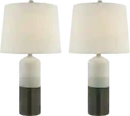 The Sherrill Cove lamp, set of 2 features a contrasting three-toned white to black finish on ceramic that is perfect for modern or transitional decor styled rooms. Topped with a crisp white drum shade that will work in a variety of decor styles. Partial assembly may be required.