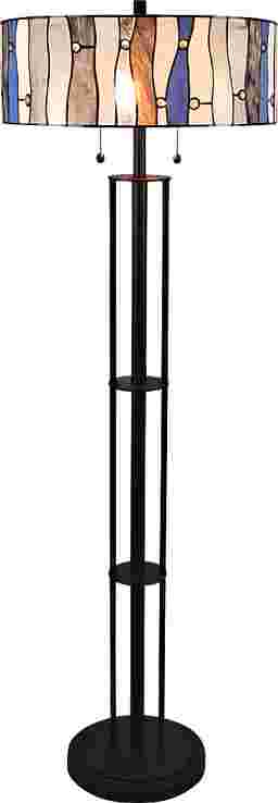 The Shiloh Avenue Tiffany lamp's statuesque silhouette and artfully crafted glass shade fashion a gorgeous form with irresistible flair. Featuring blue tones contrasted against white and gray, this floor lamp's glass shade sits over a base finished in a bronze color. This unit requires two light bulbs with 100-watt maximum capacities. Elegant chain pulls are supplied to power the lamp on and off.