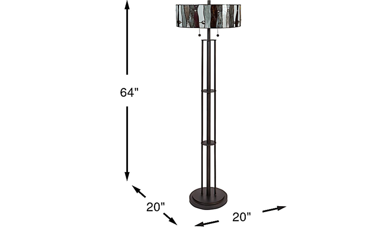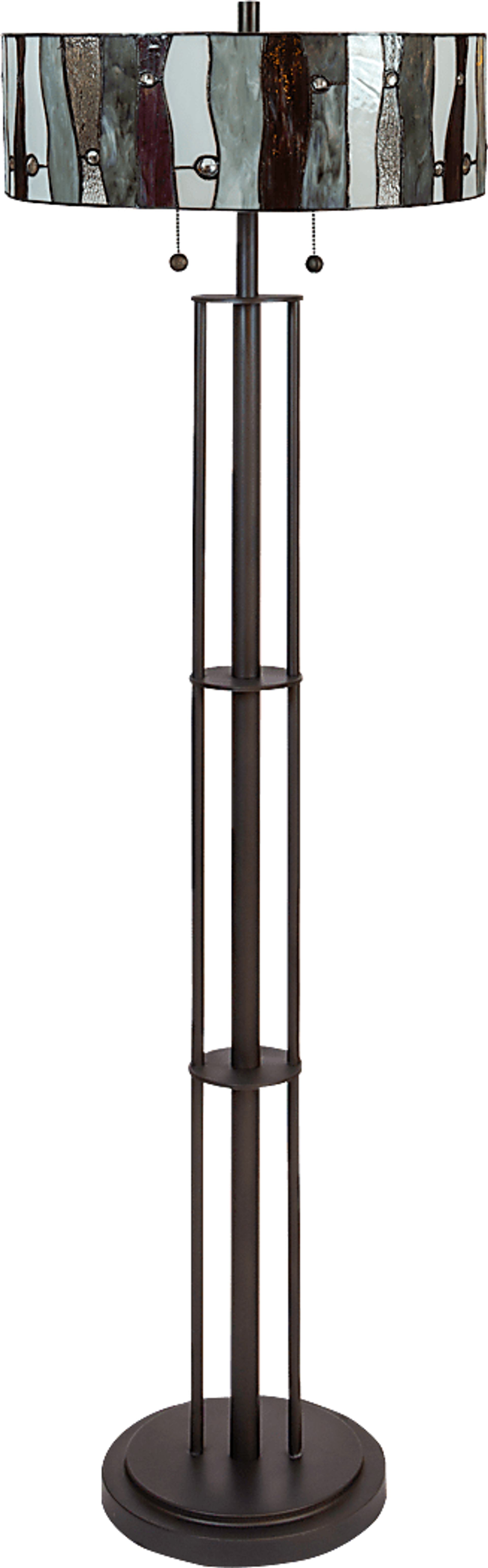 The Shiloh Avenue Tiffany lamp's statuesque silhouette and artfully crafted glass shade fashion a gorgeous form with irresistible flair. Featuring red tones contrasted against white and gray, this floor lamp's glass shade sits over a base finished in a bronze color. This unit requires two light bulbs with 100-watt maximum capacities. Elegant chain pulls are supplied to power the lamp on and off.