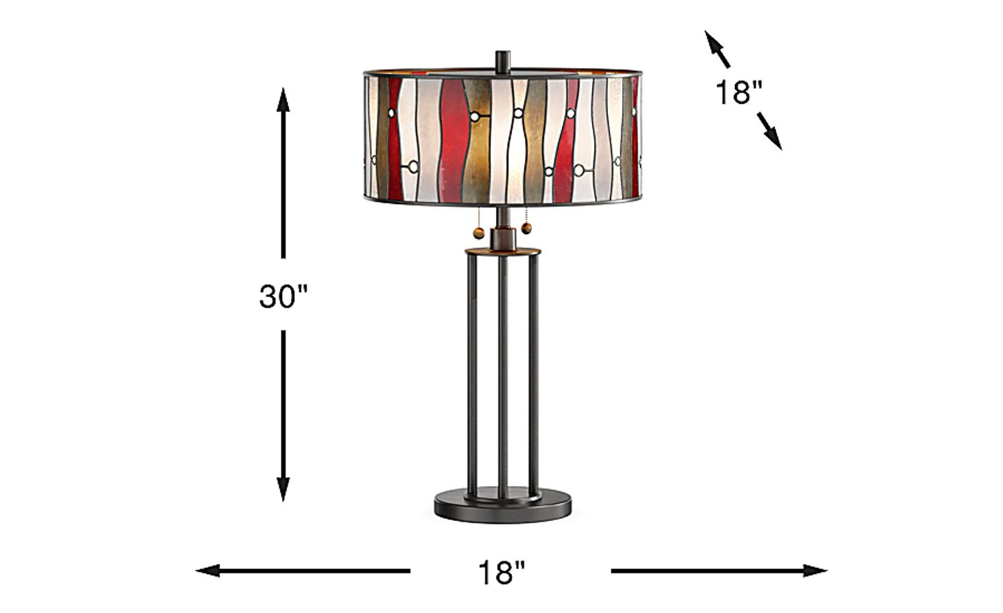 The Shiloh Avenue Tiffany lamp's statuesque silhouette and artfully crafted glass shade fashion a gorgeous form with irresistible flair. Featuring red tones contrasted against white and gray, this table lamp's glass shade sits over a base finished in a bronze color. This unit requires two light bulbs with 100-watt maximum capacities. Elegant chain pulls are supplied to power the lamp on and off.
