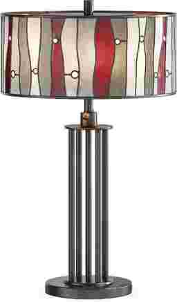The Shiloh Avenue Tiffany lamp's statuesque silhouette and artfully crafted glass shade fashion a gorgeous form with irresistible flair. Featuring red tones contrasted against white and gray, this table lamp's glass shade sits over a base finished in a bronze color. This unit requires two light bulbs with 100-watt maximum capacities. Elegant chain pulls are supplied to power the lamp on and off.