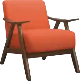 This chair features a distinct retro-inspired aesthetic characterized by its tapered legs and walnut-finished wood frame. It is an ideal choice for Mid-Century Modern or contemporary living rooms. The bold orange tweed-like upholstery serves as a vibrant focal point, allowing it to act as a statement piece when paired with neutral sofas or as a complementary accent in a more eclectic, colorful space.