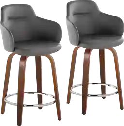 These stools are constructed with a solid wood base featuring a dark walnut finish. To safeguard high-end flooring like hardwood or laminate, we recommend applying felt pads to the bottom of the legs. This simple proactive step, combined with the built-in swivel functionality, provides a high level of protection against scuffs and scratches.