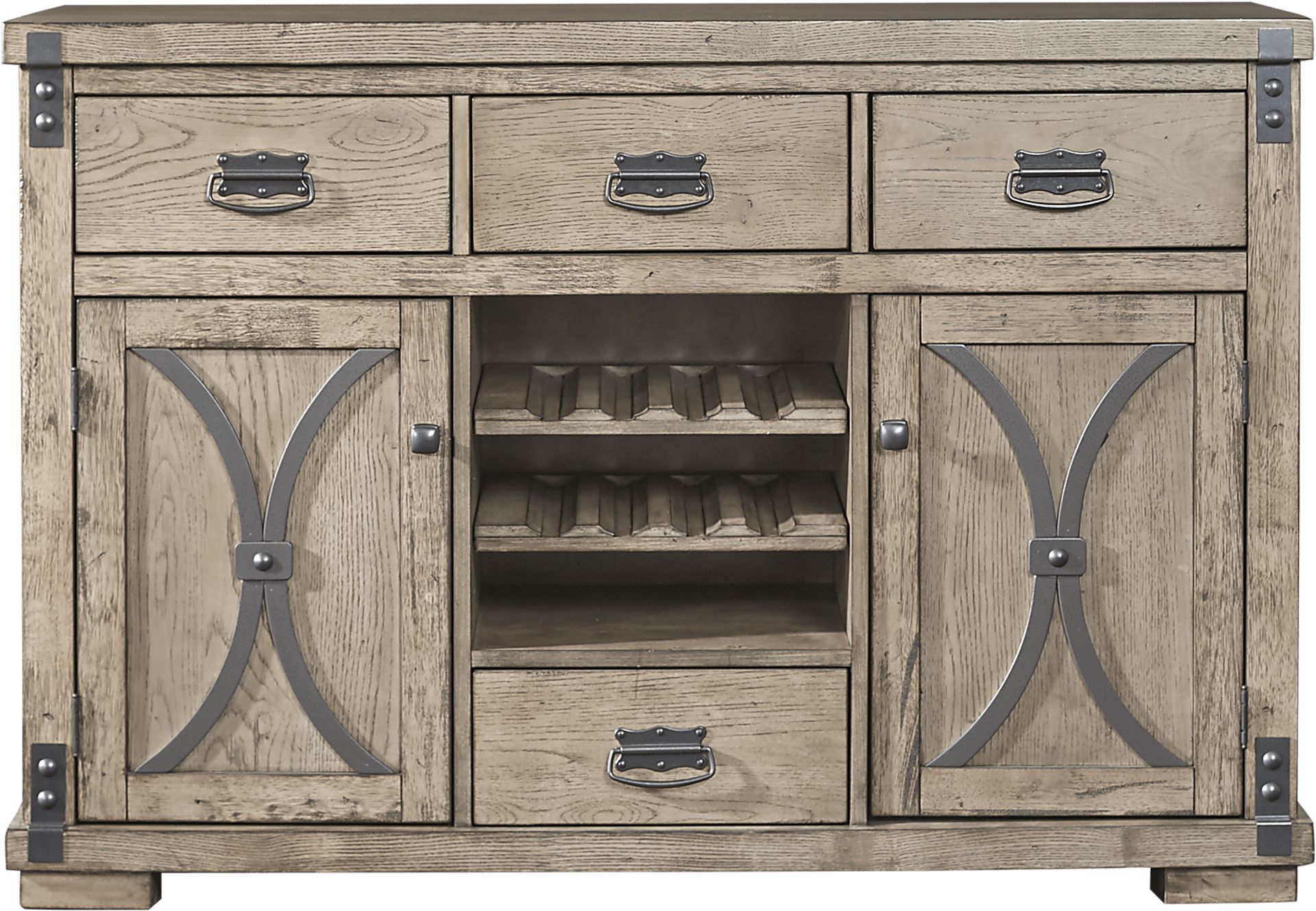 A charming addition to its matching collection, the Sierra Vista server is spacious and versatile. Crafted with wood solids and oak veneers, a neutral distressed driftwood finish is accented with faux metal to create a warm, industrial touch. Four drawers, two doors, and bottle storage add practicality, allowing you to easily organize your favorite dishes or wine bottles conveniently near your dining room.