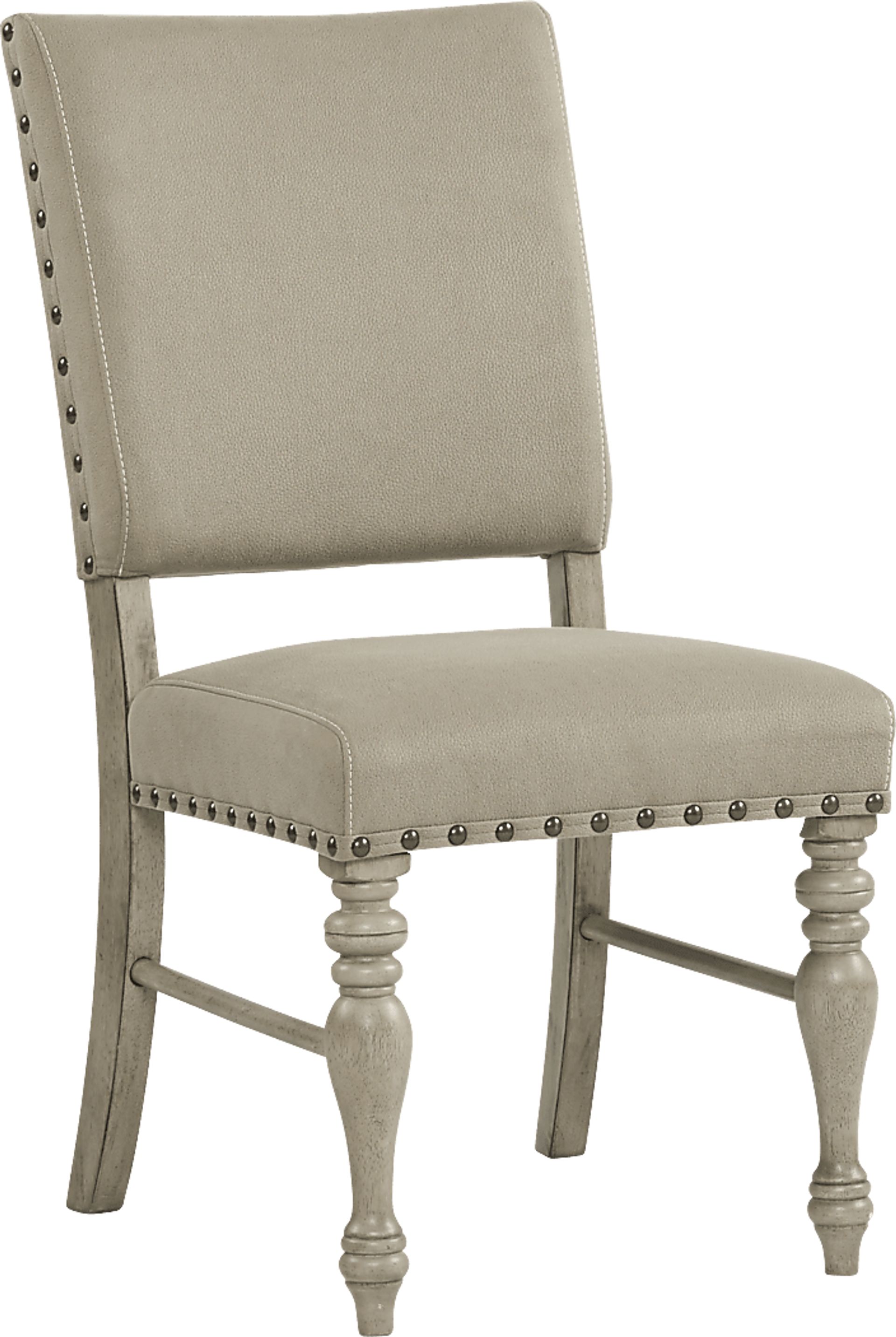 A fantastic addition to its matching table, the Sierra Vista side chair offers a comfortable and stylish place to enjoy each mealtime. The upholstered seat and back are accented with nailhead trim, emphasizing its casual charm. Crafted with wood solids and oak veneers, a neutral driftwood finished base features distressed details for a rustic touch.