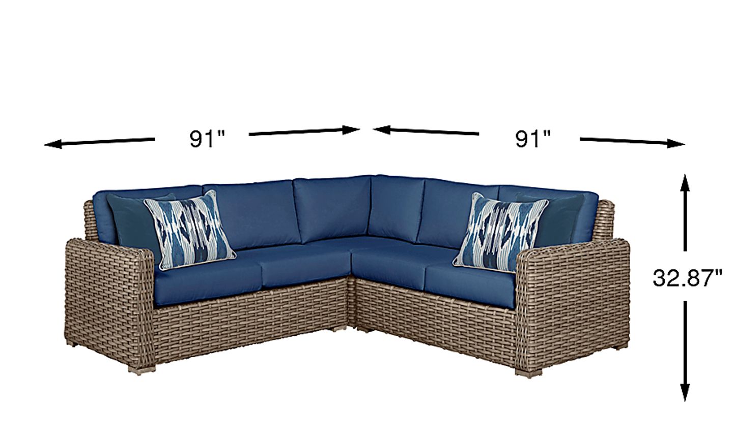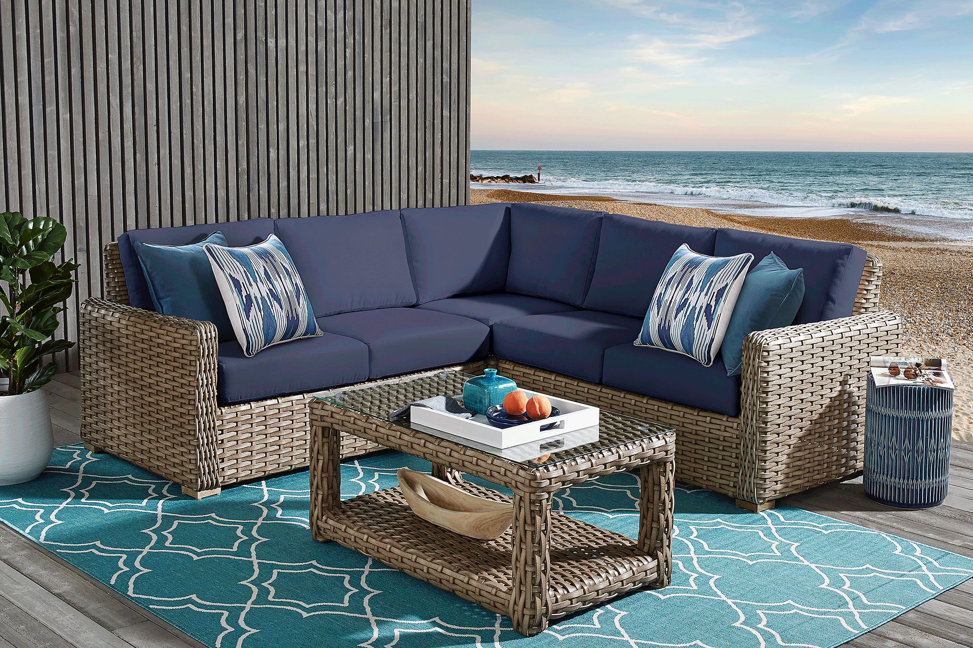 The Siesta Key sectional provides ample seating so the whole family can enjoy your beautiful patio space. Constructed from large weave all-weather woven wicker in a driftwood finish for a tropical feel steeped in casual comfort, a rust-resistant powder coated aluminum frame creates durability. Indigo colored Sunbrella cushions are UV resistant and sturdy, providing a beautiful look. Four decorative toss pillows add the perfect accent.