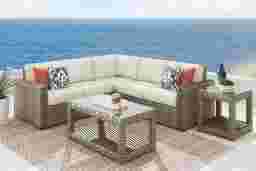 The Siesta Key sectional provides ample seating so the whole family can enjoy your beautiful patio space. Constructed from large weave all-weather woven wicker in a driftwood finish for a tropical feel steeped in casual comfort, a rust-resistant powder coated aluminum frame creates durability. Desert beige cushions are UV resistant and sturdy, providing a beautiful look. Four decorative toss pillows add the perfect accent. Select cushion colors also available in Sunbrella fabric.