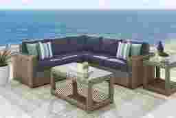 The Siesta Key sectional provides ample seating so the whole family can enjoy your beautiful patio space. Constructed from large weave all-weather woven wicker in a driftwood finish for a tropical feel steeped in casual comfort, a rust-resistant powder coated aluminum frame creates durability. Inky blue cushions are UV resistant and sturdy, providing a beautiful look. Four decorative toss pillows add the perfect accent. Select cushion colors also available in Sunbrella fabric.