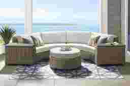 Create a cozy outdoor gathering space with the Siesta Key curved sectional. Offering seating for up to four people, the sectional is crafted with a durable rust-resistant powder coated aluminum frame and large weave all-weather wicker in a driftwood finish. Desert beige cushions are UV resistant and sturdy, providing a beautiful look. Four decorative toss pillows add the perfect accent, while the two wedge-shaped end tables provide surface space for magazines, sunscreen and more. Select cushion colors also available in Sunbrella fabric.