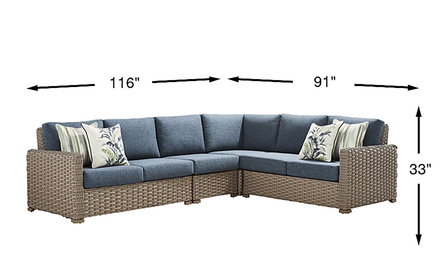 The footprint of this 4-piece sectional is 91"w x 116"d x 33"h. Based on our layout expertise, we recommend leaving at least 18 to 24 inches of clearance around the perimeter to allow for comfortable walkways. This L-shaped configuration is ideal for defining a specific seating zone on a larger deck or tucking neatly into a patio corner to maximize floor space.