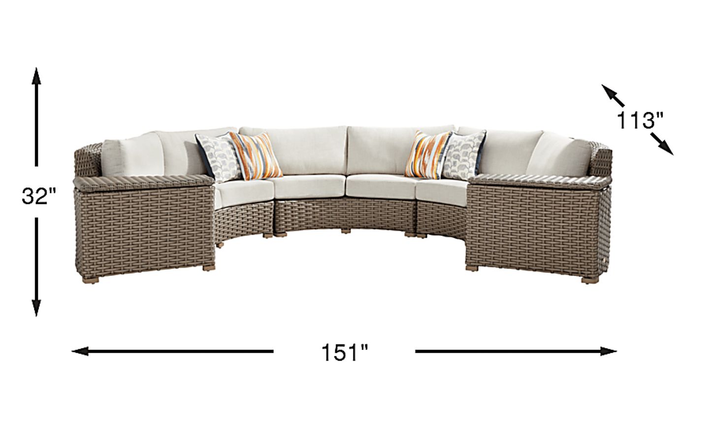 This is a substantial piece of furniture with a footprint of 151" in width and 113" in depth. Because of its curved silhouette, it functions best as a floating focal point on a large deck or patio rather than being placed flush against a wall. To ensure proper flow in your outdoor living area, our experts recommend mapping out a space that allows for at least 24 inches of clearance around the perimeter for comfortable foot traffic.