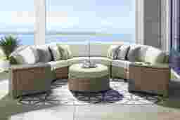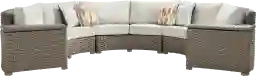 Create a cozy outdoor gathering space with the Siesta Key curved sectional. Offering seating for up to six people, the sectional is crafted with a durable rust-resistant powder coated aluminum frame and large weave all-weather wicker in a driftwood finish. Desert beige cushions are UV resistant and sturdy, providing a beautiful look. Four decorative toss pillows add the perfect accent, while the two wedge-shaped end tables provide surface space for magazines, sunscreen and more. Select cushion colors also available in Sunbrella fabric.