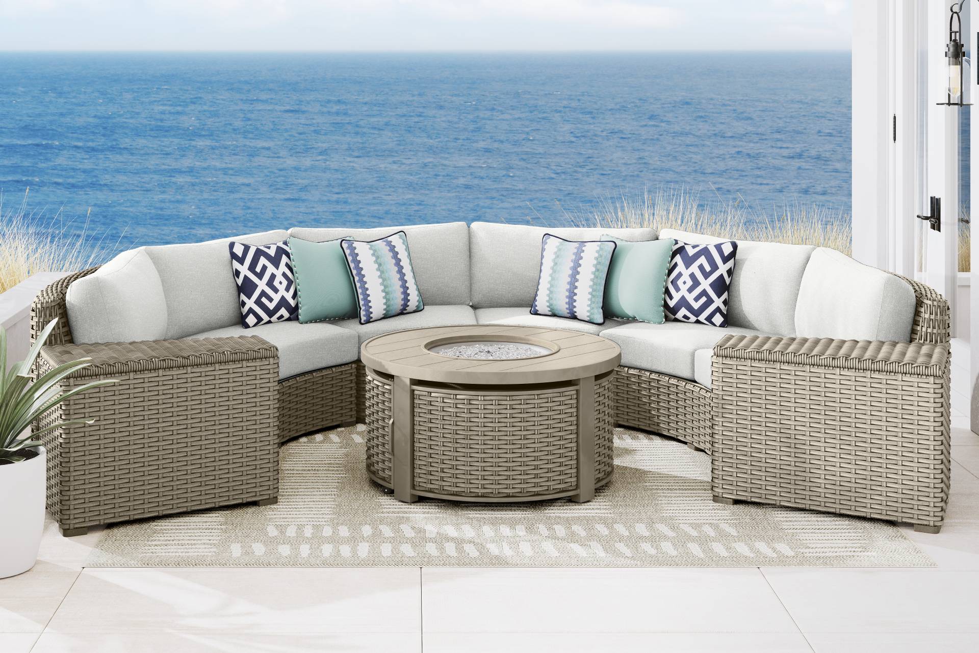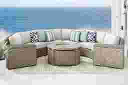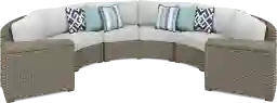 Create a cozy outdoor gathering space with the Siesta Key curved sectional. Offering seating for up to six people, the sectional is crafted with a durable rust-resistant powder coated aluminum frame and large weave all-weather wicker in a driftwood finish. Dove gray cushions are UV-resistant and sturdy, providing a beautiful look. Decorative toss pillows add the perfect accent, while the two wedge-shaped end tables provide surface space for magazines, sunscreen and more.