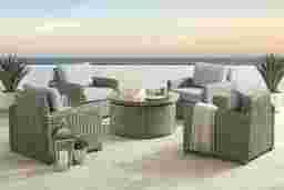 Siesta Key Driftwood Finish 5 Pc Outdoor Fire Pit Seating Set with Dove Cushions