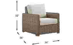 This chair is designed with a "Tropical" style that features a driftwood finish and a large-weave pattern. It is perfect for creating a relaxed, resort-like atmosphere. The neutral desert beige cushions and light wood finish allow it to blend seamlessly with lush greenery, poolside setups, or even modern bohemian decors. For a cohesive look, it can be paired with other pieces from the Siesta Key collection, such as matching ottomans or end tables.