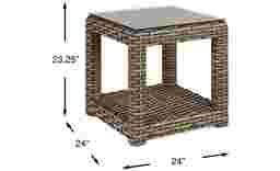 Stylishly situated on a rust-resistant powder coated aluminum frame beneath large weave all-weather woven wicker in a driftwood finish, the Siesta Key end table is stylish enough for both indoor and outdoor placement. Topped with glass, it's easy to clean and looks especially chic when paired with its coordinating collection.