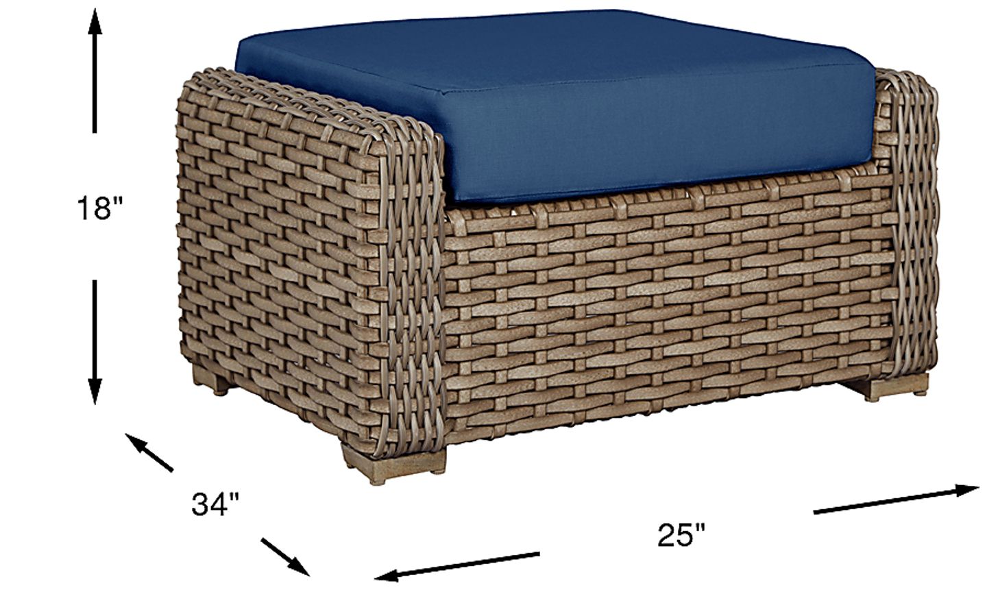 Take your patio comfort to the next level with the compact and sturdy Siesta Key ottoman. The perfect piece to accompany its matching collection, it's easy to become relaxed with your feet propped up and the sun shining around you. Constructed from large weave all-weather woven wicker over a rust-resistant powder coated aluminum frame, an upholstered indigo-colored Sunbrella cushion is resistant to fading and looks great season after season. To clean Sunbrella fabric cushions remove dirt and spray on cleaning solution (water and mild soap), then use a soft bristle brush or sponge. Allow cleaning solution to soak into fabric and rinse thoroughly until soap residue is removed. Air dry. Do not dry clean.