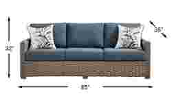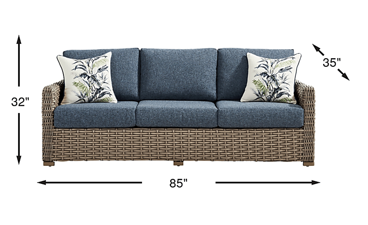 The Siesta Key sofa provides ample seating so the whole family can enjoy your beautiful patio space. Constructed from large weave all-weather wicker over a weather-resistant powder coated aluminum frame, the breezy tropical look of this seat adds a casual feel. Inky blue outdoor cushions are UV-resistant and sturdy, providing a beautiful look. A pair of decorative toss pillows add the perfect accent.