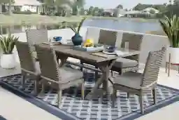 Make mealtime memories on your patio with the Siesta Key dining set. Pairing a 76-inch solid eucalyptus table with all-weather wicker side chairs, this group is as durable as it is stylish. An umbrella hole in the center of the table can be capped when not in use. Each side chair features an attractive large weave design and a padded seat cushion in a UV-resistant dove gray color.