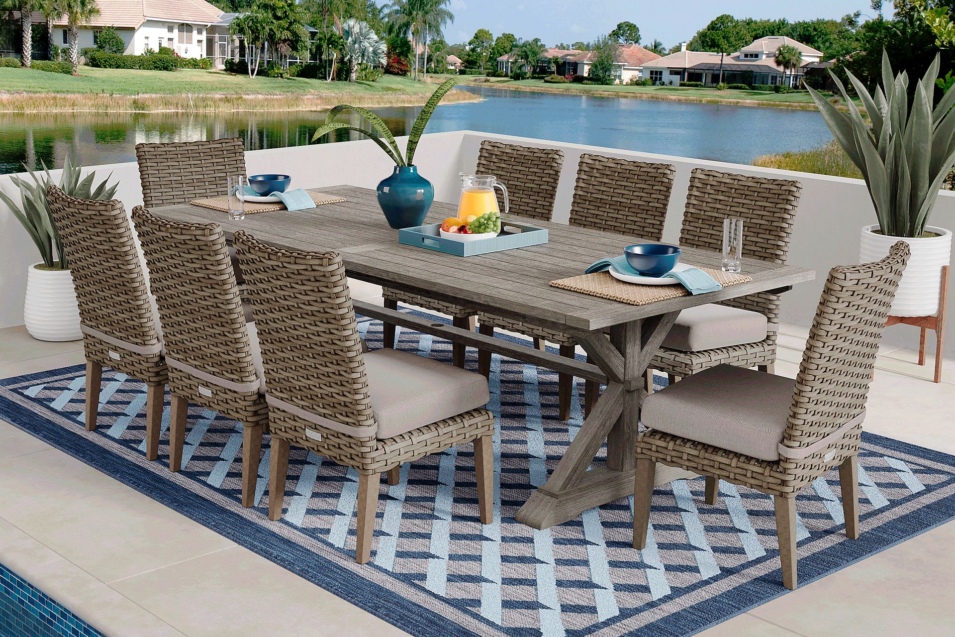 Make mealtime memories on your patio with the Siesta Key dining set. Pairing a 102-inch eucalyptus table with all-weather woven wicker side chairs, this group is as durable as it is stylish. Each side chair with an attractive large weave design features a padded seat cushion in a twine color that is UV resistant. Select cushion colors also available in Sunbrella fabric.