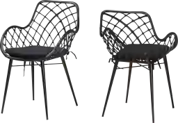 Enjoy a peaceful air for every meal with the exotic craftsmanship of the Sigourney black dining chair, set of 2. This bohemian piece consists of a solid metal frame topped with a handcrafted rattan seat. Its plush, fabric upholstered seat cushion offers superb comfort while the backrest slopes around the seat to form convenient armrests. The Sigourney utilizes angled legs connected by a crisscross base for excellent stability and support. Sporting a cozy design with minimalist charm, the Sigourney is sure to become a beloved part of any arrangement. Due to the nature of the natural materials used in this product, it may have variations in areas such as, but not limited to, color, pattern, grain and texture. The hair-like strands of rattan/rattan-fiber are common due to the nature of the material. Customer assembly is required.