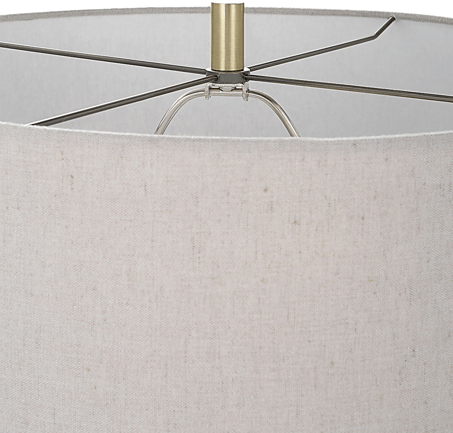 A beautiful display of color and style, the ceramic Silas Loop lamp features an embossed design with a unique mix of matte and gloss glazes in various shades of blue-green, indigo, and golden rust, paired with antique brass plated details. The hardback drum shade is covered in a light gray linen fabric with natural slubbing. Partial assembly may be required.
