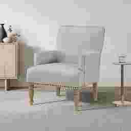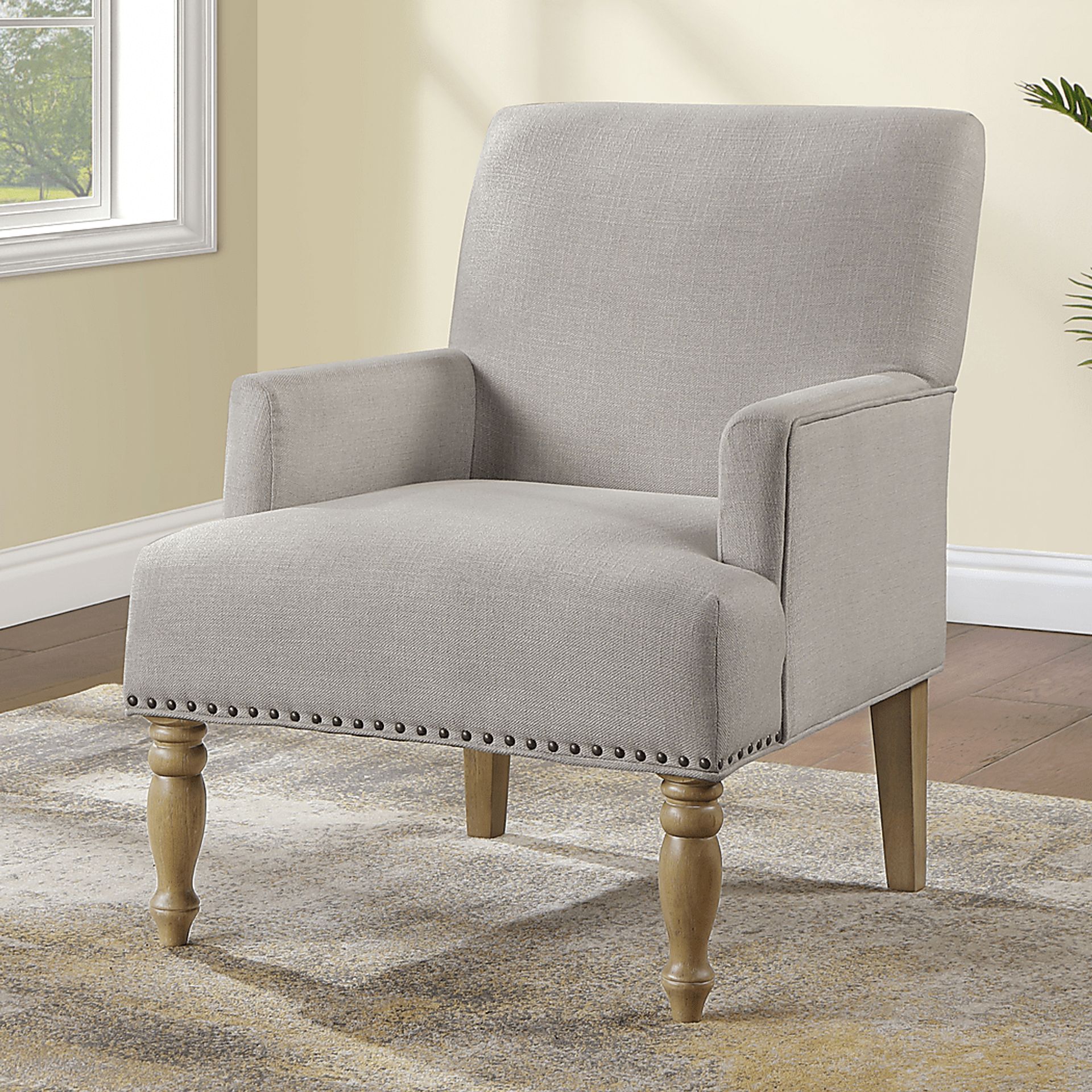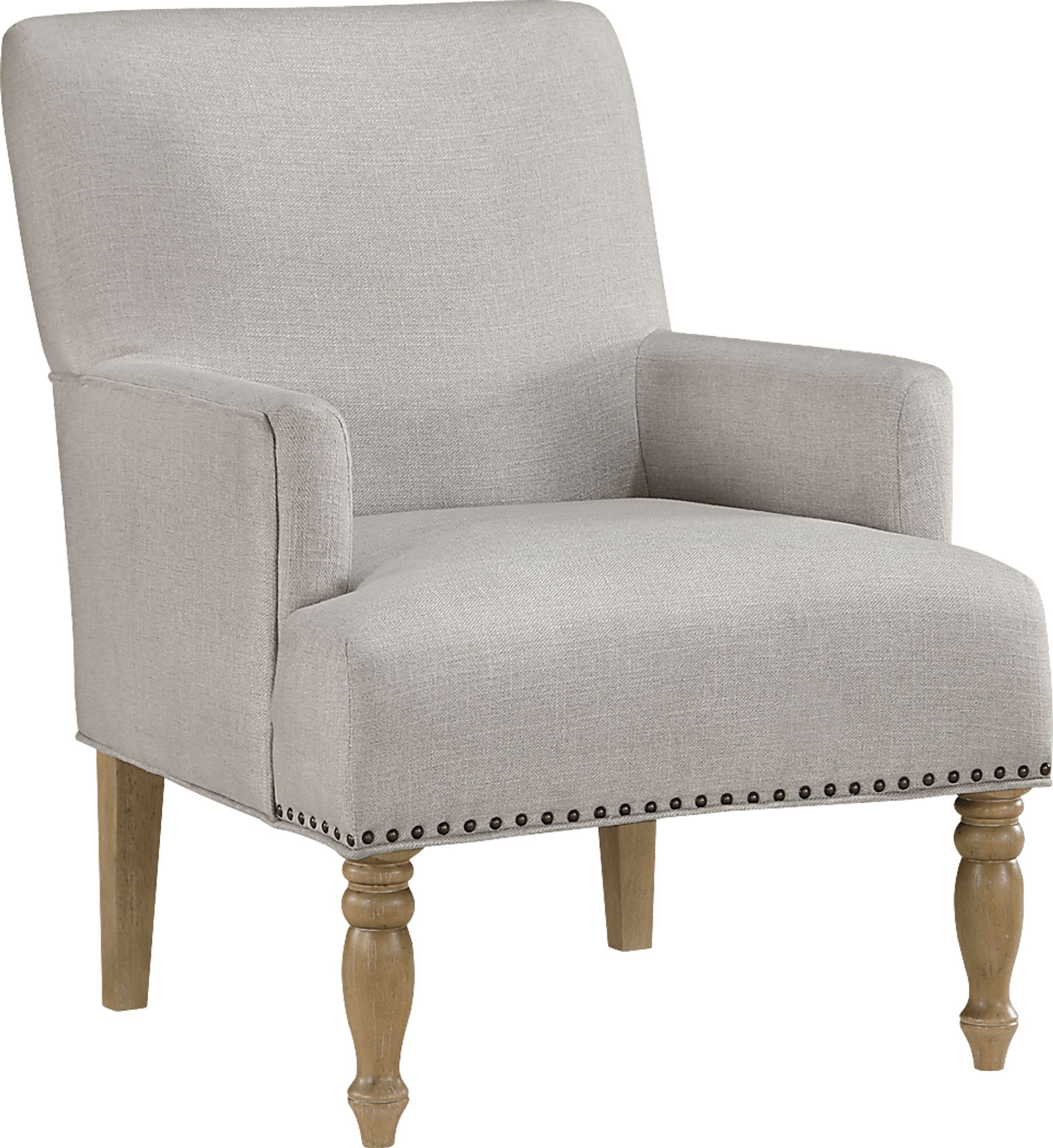 Discover the perfect blend of style, comfort, and durability with our exquisite Sillas arm chair. Our chair is built to last, with a sturdy combination of hardwood and plywood frame construction. The beautiful combination of beige fabric and pecan finished legs creates an inviting and sophisticated look that complements any decor. Stylish details like antique brass nail heads and welting add a touch of luxury. Sink into the cozy embrace of our chair. The combination of sinuous springs and pocket coil springs provides outstanding seat comfort, making it the perfect spot for relaxation. The turned, solid wood legs add a touch of classic charm, elevating the overall aesthetic of the chair. Crafted with 100% polyester fabric, this chair is not only comfortable but also easy to clean, ensuring it looks great for years to come. Customer assembly is required.