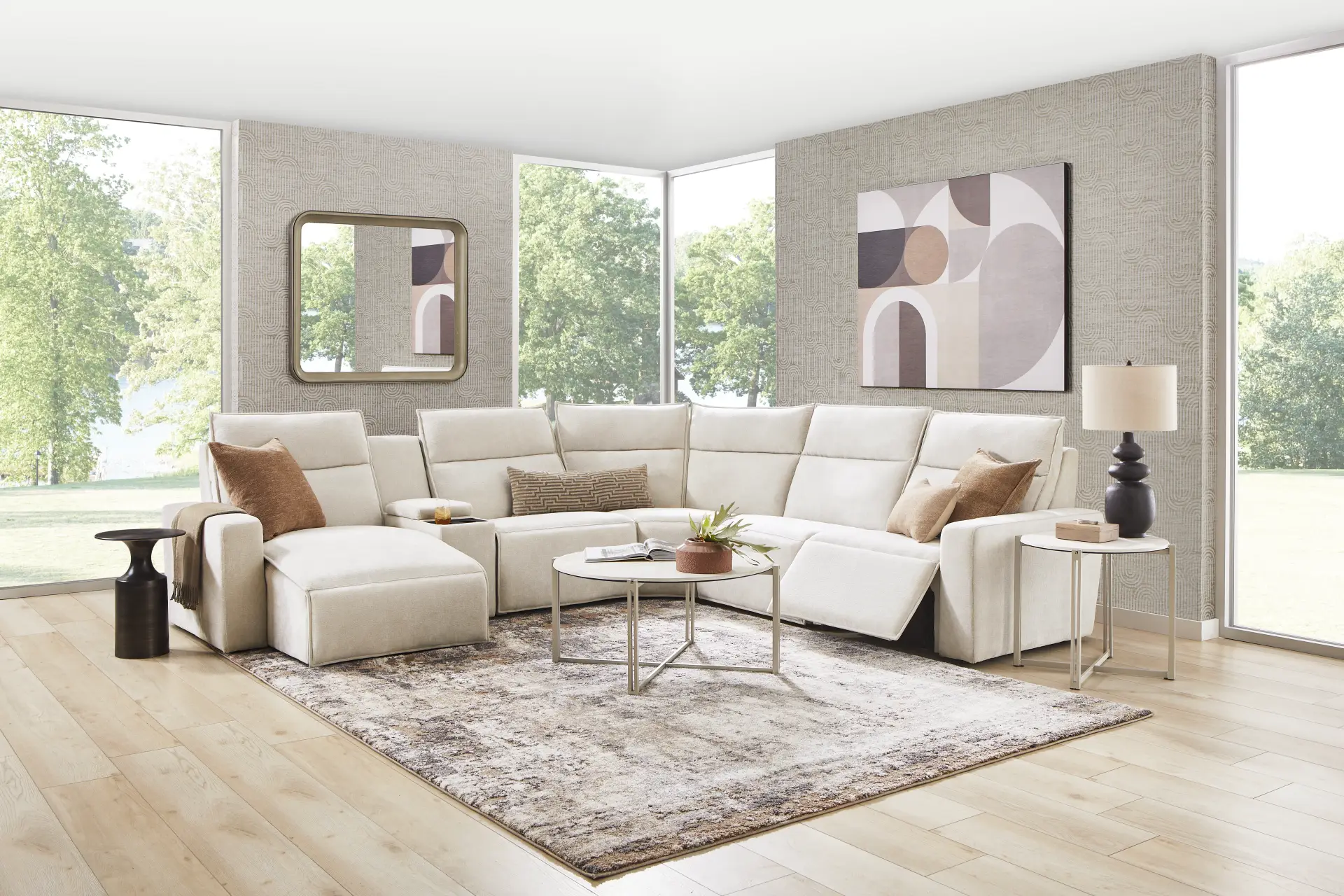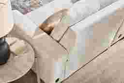 The integrated media console is engineered to be a functional hub for your living area. It features a built-in Bluetooth-enabled sound system for an immersive audio experience, wireless charging capabilities for compatible mobile devices, and retracting cupholders that can be tucked away to maintain a clean, contemporary aesthetic when not in use.