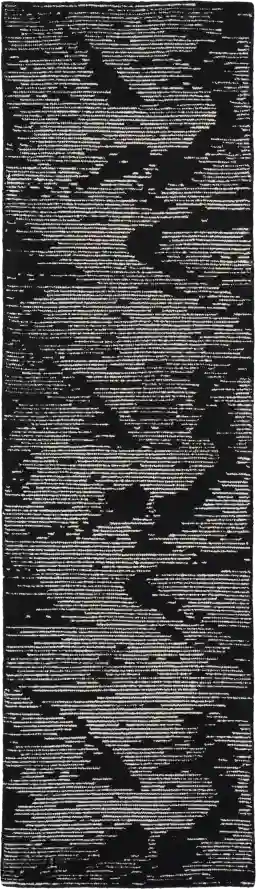 Reminiscent of a city skyline emerging in a morning fog, the depth and originality of the Silver Falls rug is displayed through its shimmering accents and artistic design. The etched, linear silhouette is elevated by the dark background and silk-like texture of this high-low pile rug.