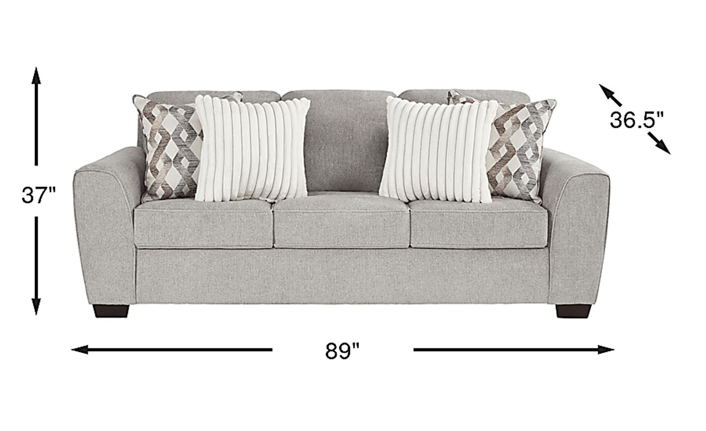 A relaxed style tailored with subtle flares of sophistication in the Silverman living room brings a warm, intimate atmosphere suffused with a subtle grace. Upholstered in a smooth chenille fabric, this traditional sofa features stylish wedge arms and welted stitching for a look of casual elegance. Dark block legs complement the smooth gray color while emphasizing the inviting aesthetic. Attached back cushions provide a dash of chic while the loose seat cushions allow for easy adjustment and maintenance. Decorative throw pillows are included for added style and texture. Upholstery: 100% Polyester