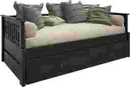 Featuring classic Mission styling, the Simi Valley daybed with trundle is a timeless choice. Crafted of Pine and Eucalyptus solids in a stunning black finish, this traditional daybed is tastefully embellished with bronze finished pulls on the included trundle. The daybed and trundle each accommodate a standard twin size mattress (not included). Mattress sold separately.