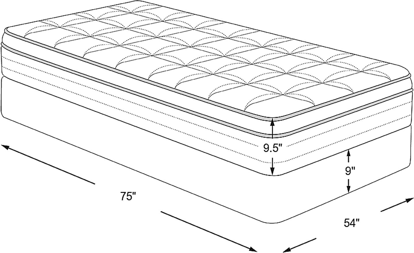 mattress: 75"l x 54"w x 9.5"h, foundation: 8.5"h