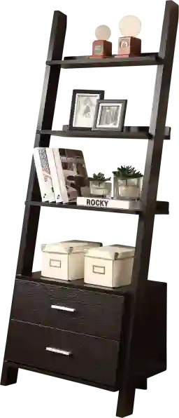 Who can resist this Singleton ladder style bookcase? The four graduating open shelves provide ample room to display pictures, decorative pieces, or books with tipping hardware included for further stability when placed against a wall. Two convenient storage drawers accented with sleek silver metal handles adds even more space to put away accessories within easy reach. A contemporary design in a rich cappuccino finish, the exquisite symmetry of this ladder bookcase adds style to a living room, home office, or hallway. Customer assembly required.