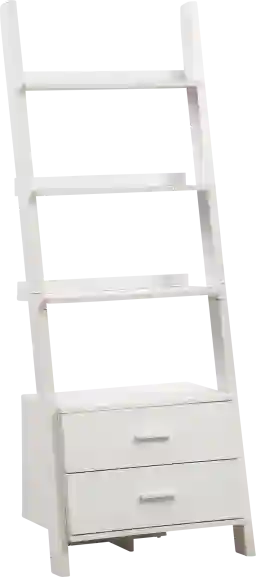 Who can resist this Singletonladder style bookcase? The four graduating open shelves provide ample room to display pictures, decorative pieces, or books with tipping hardware included for further stability when placed against a wall. Two convenient storage drawers accented with sleek silver metal handles adds even more space to put away accessories within easy reach. A contemporary design in a rich white finish, the exquisite symmetry of this ladder bookcase adds style to a living room, home office, or hallway. Customer assembly required.