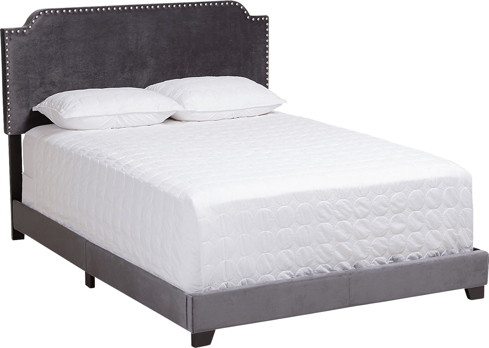 Indulge your sophisticated tastes with the Skylyn bed. The luxe and glamour-inspired design of the bed is evident in its eye-catching details. The Skylyn's frame is built to last with solid rubberwood and engineered wood. The frame and sumptuous headboard are upholstered in velvet upholstery. The foam-padded headboard features a chrome finished nail head trim, adding yet another element of luxury to the Skylyn. Customer assembly is required. Customer assembly is required.