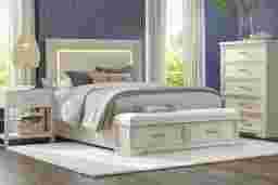 The sculptured look and soothing feel of the Cindy Crawford Home Royal Park bedroom brings a refined tranquility to your restorative retreat. Showcasing embossed cherry veneers in a subtle champagne finish, this casual contemporary room features a chic upholstered headboard framed by an inlaid design. A recessed inner panel conceals LED lights that when lit create an elegant, halo effect and twin storage drawers provide plenty of room for blankets, pillows, and other nighttime necessities. The accompanying chest and nightstand include side mounted ball-bearing glides and English dovetail construction for support and longevity, as well as the same clean lines and picturesque aesthetic as the bed, creating a pleasingly cohesive look and feel. Mattress and foundation (if required) sold separately.