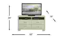 Take media storage to a new level with the sleek and chic Cambrian Court console. Crafted of poplar and wood solids with white ash veneers in an ash white finish, this 62 inch console has two open cubbies and four deep storage drawers. Pass through holes on the back panel keep wires tucked neatly out of view. Each drawer, with contemporary bar pulls, is made with premium English and French dovetail joints for strength and stability. Gold finished trim adds a subtle yet compelling accent. Customer assembly required.