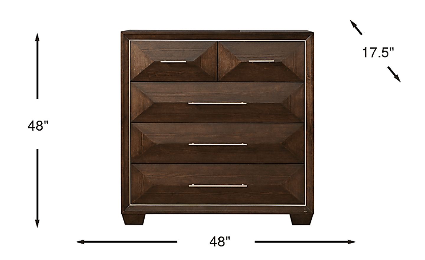 Spacious, stylish and sleek, the contemporary Cambrian Court bureau offers the perfect compromise between a dresser and a chest. With five drawers each utilizing strengthening French and English dovetail construction, this sturdy piece is beautifully accented with gold finished trim and bar pulls. Crafted of poplar and wood solids with white ash veneers in a rich chocolate finish, raised faceted panels on the drawer fronts make this bureau truly special.