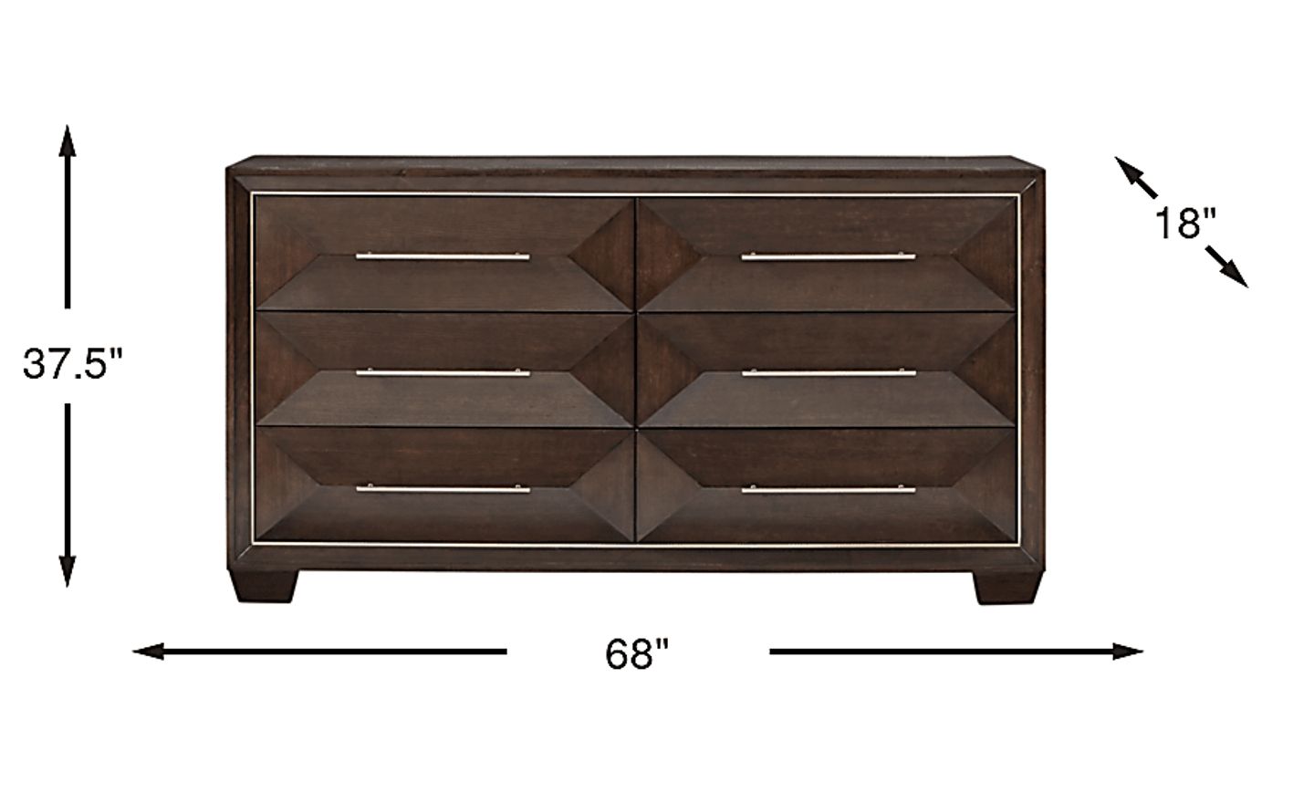 Unique contemporary style with a high end look, the Cambrian Court dresser offers a sophisticated bedroom storage solution. Crafted of poplar and wood solids with white ash veneers in a rich chocolate finish, this six drawer dresser utilizes premium English and French dovetail drawer construction. Raised faceted panels on each drawer front creates a jewelry-inspired look, while gold finished trim and bar pulls add delicate contemporary accents.