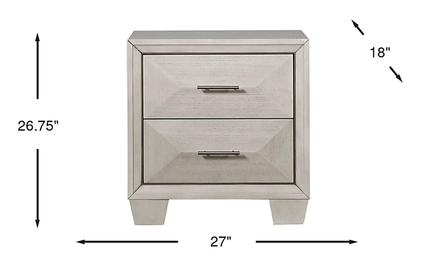 A stylish beside companion, the Cambrian Court nightstand adds a contemporary touch to your bedroom. Crafted of poplar and wood solids with white ash veneers in an ash white finish, this designer quality nightstand features premium English and French dovetail drawer construction. Unique raised faceted panels on the drawer fronts, beautifully accented with gold finished trim and bar pulls, creates a sweet, sophisticated look.