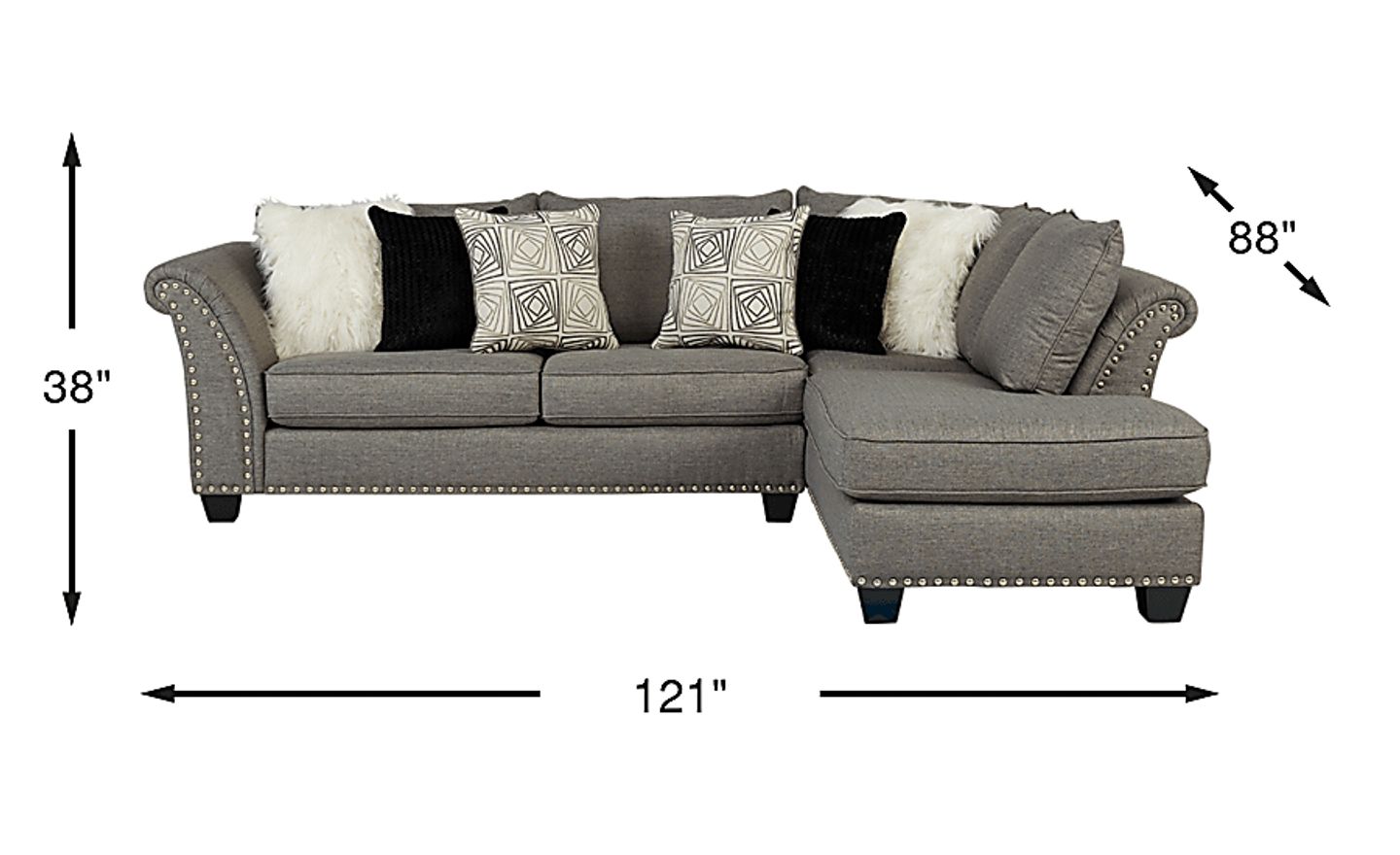 Bring stylish, contemporary looks influenced by transitional elements into your home with the timeless Claremont sectional. Upholstered in a soft, woven fabric in an attractive gray color, this sectional transforms any space into a relaxing haven. Flare arms and nailhead detail bring an elegant appeal to this sectional making it a must have for any modern living space while reversible seat cushions ensure this sectional is as long lasting as its style. 100% Polyester