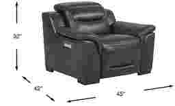 Nothing says king (or queen) of the castle like the luxurious Gallia Way recliner, covered in supple navy top grain leather where the body touches. This contemporary recliner features a dual power adjustable headrest and footrest, guaranteeing your comfort as you kick back and sink into the plush tufted back cushion and padover chaise footrest. A built-in charging USB port is the icing on this stylish cake. Upholstery: Top Grain Leather where the body touches with Vinyl sides and backs.