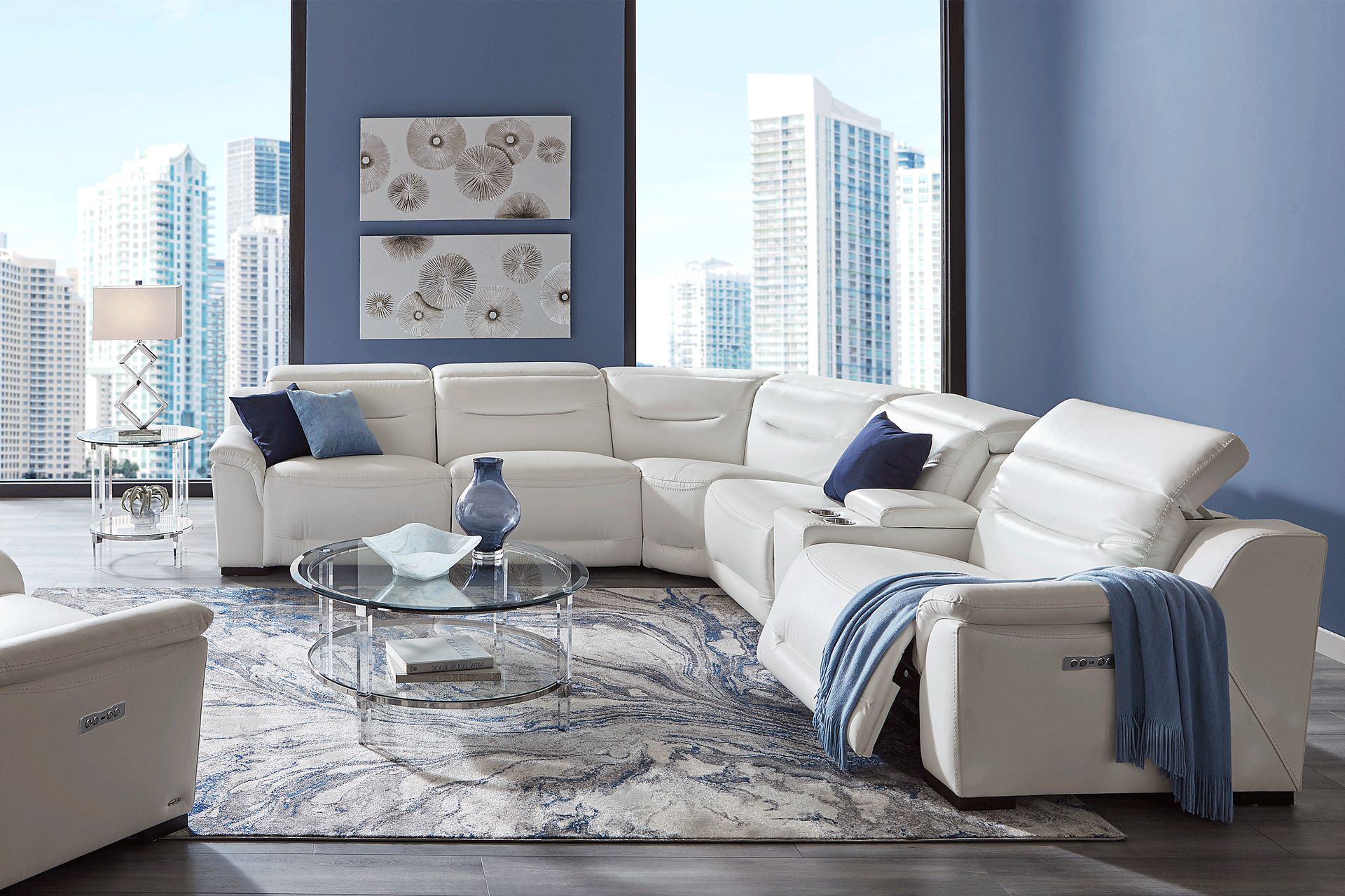 Sit in the lap of luxury with the sumptuous comfort and good looks of the contemporary Gallia Way sectional. Seating up to five adults, this chic sectional is upholstered in premium white top grain leather wherever the body touches. Dual power adjustable headrests and footrests allow you to relax with the touch of a button, while plush tufted back cushions and padover chaise style footrests feel like a dream come true. Convenient cup holders and storage in the console, plus built-in charging USB ports on the end recliners cater to your every need. Chic, smart and comfortable: what more could you ask for? Upholstery: Top Grain Leather where the body touches with Vinyl sides and backs.