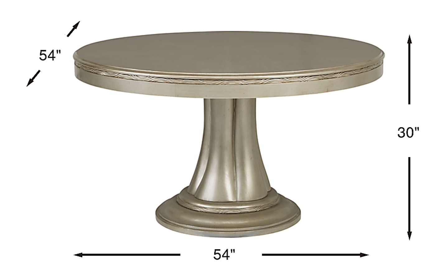 Everyday elegance is yours with the La Reina dining table. This chic pedestal table has a beautiful 54-inch round top enhanced with rope moulding and a statement making sliver finish that adds to the impact of this stunning gathering place. The table is crafted with solid wood framing, poplar solids and birch veneers.
