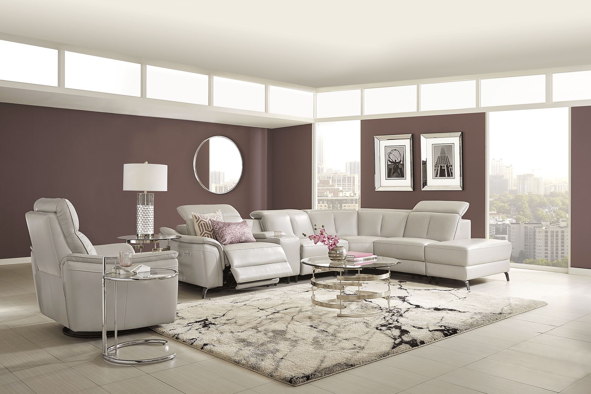 Redefine your living space with the modern lines and sleek silhouette of the Naples sectional. Upholstered in soft and luxurious top grain leather where the body touches in a light gray hue, this piece comes equipped with a dual power recliner whose adjustable head and footrest can be raised and lowered with the push of a button, keeping you cradled in comfort. It also features a USB charging port on one side and a console with lift-top storage and two cupholders to keep your must-haves organized. Top grain leather where the body touches and vinyl sides and backs.