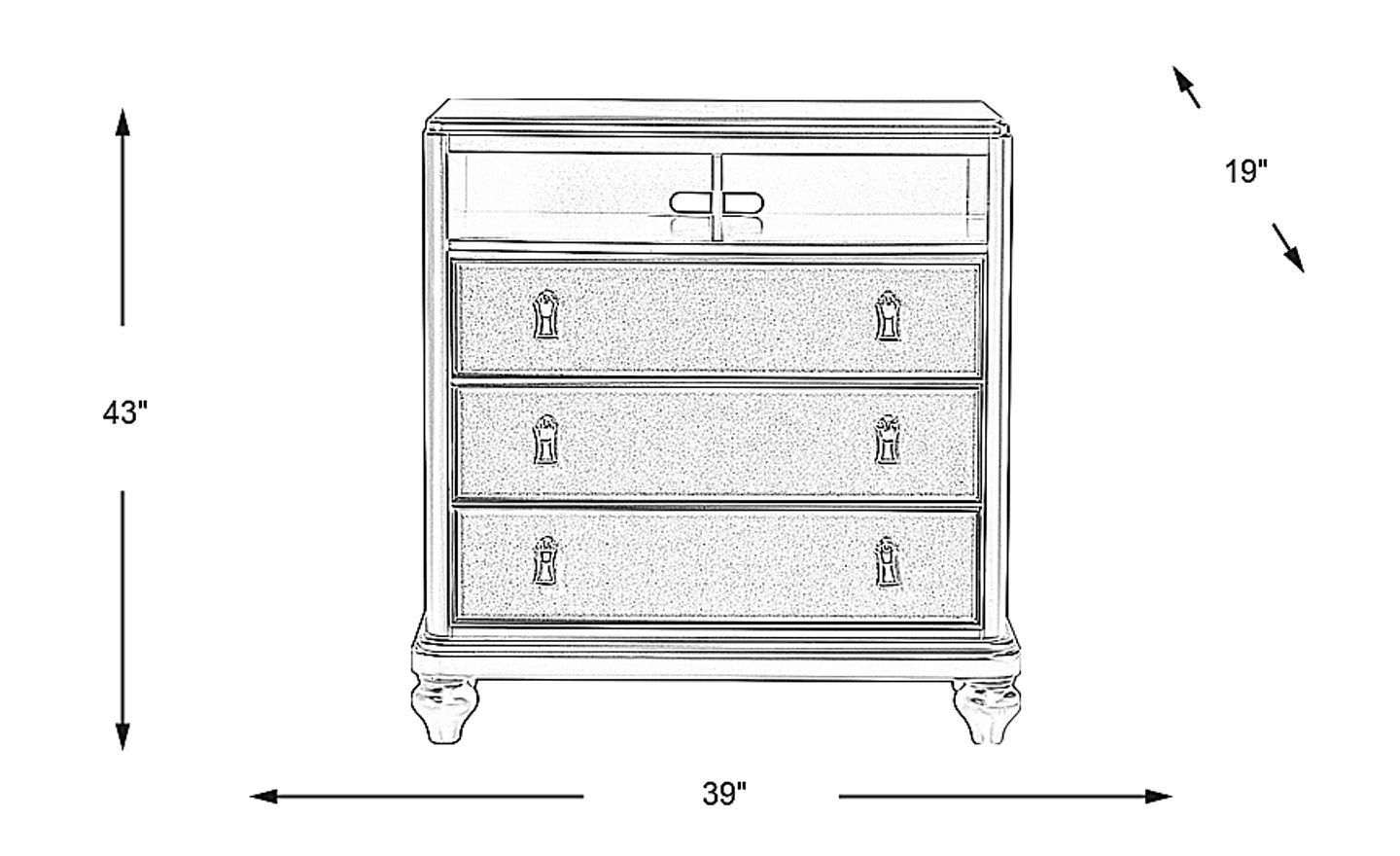 Feeling fancy? The glamorous Paris small chest even makes storage feel elegant. Crafted of pine solids and birch veneers in a stunning silver finish, this chic chest features three drawers and two open compartments with wiring pass through holes. With sturdy English and French dovetail drawer construction and stylish details such as turned legs and chrome finished drawer pulls, this media chest has thought of everything!