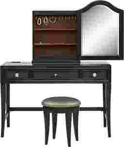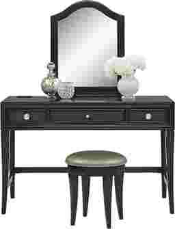 A perfect primping station, the Petit Paris vanity, mirror, and stool set can help your child prepare for the day ahead. Crafted of pine solids and birch veneers in a stunning black finish, the vanity desk features three drawers accented with crystal knobs, and two plugins and two USB outlets on the back. The vanity mirror has a stylish design, with a beautiful molding that perfectly frames the beveled glass surface. The mirror slides open, revealing two shallow shelves and a row of jewelry hangers. Coordinating fabric on the included stool features a lovely nailhead trim.